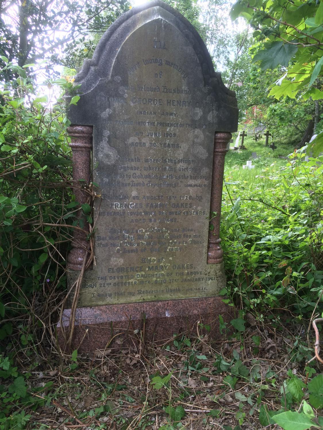 At a glanceAt a glanceSurname: OakesFirst name: FlorenceOther Christian names: Mary Gender: FemaleChildren: NoBurial number: 1900Born: 22/10/1874Died: 21/01/1961Buried: 27/01/1961Occupation: Private MeansHeene Hallmark: NoCommonwealth War Grave: No The GraveThe graveCemetery area: SESCemetery row: 9Cemetery plot: 21what3words location: https://what3words.com/gangs.vine.fearBurial remains: Unknown The headstoneEndowed grave: NoHeadstone inscription: In ever loving memory of my beloved husband Colonel George Henry Oakes Indian Army who passed into the presence of the Lord 4th June 1909 aged 70 years "O death where is thy sting? O grave where is thy victory? Thanks be to God which giveth us the victory through our Lord Jesus Christ" 1 Cor. XV 55.57 Followed on August 16th 1926 by Frances Fanny Oakes his dearly loved wife for over 48 years aged 84 years "Just as I am without one plea but that Thy blood was shed for me and that Thou bidd'st me come to Thee O lamb of God I come" Also of Florence Mary Oakes the devoted daughter of the above born 22nd October 1874 died 21st January 1961 "I know that my Redeemer liveth" Job 19 v.25 Grave location map Life storyLife storyFlorence was born in Bellary, Madras, India, the daughter of Captain George Henry Oakes and his wife Frances Fanny. George was serving with the Madras Staff Corps as Overseer of the Commsariat Department. This dealt with supplying the British Army with food, clothing etc but not weapons. Florence lived with her parents all her life and never married. The family returned to England permanently by 1891 and settled in Weymouth until George retired in 1896. Florence and her parents visited Worthing in 1901 and made the decision to live there, firstly at "Ferndale" in Winchester Road in 1905 and then at "Teviotdale" in Mill Road. George died here on 4th June 1909. Florence and her widowed mother moved to "Montrose" in Belsize Road. Fanny died on 16th August 1926 and was buried beside her husband at Heene. Florence spent the rest of her life at 37 Belsize Road until just before her death in 1961. She died at Charlwood Nursing Home, 2 Farncombe Road, Worthing on 16th August. Probate was granted on 30th August to Lloyds Bank Limited. Effects £3757 5s 6d.Burial researcher: Carol Sullivan Further informationBirthDate born: 22/10/1874 DeathDeath (details)Date of death: 21/01/1961Age (at time of death): 86Cause of death: UnknownAddress at time of death: Charlwood Nursing Home, 2 Farncombe Road, Worthing, Sussex, EnglandUsual address at death: Montrose, 37 Belsize Road, Worthing, Sussex, England Personal effectsProbate pounds: £3,757 Census and miscellaneous informationCensus information1891 census: "Southsyde" Alexander Road, Weymouth, Dorset George aged 51, army colonel Indian Staff Corps. Fanny aged 48. Florence aged 16. Douglas aged 14. Plus 2 servants.1901 census: 79 Marine Parade, Worthing, Sussex. George aged 61, colonel Indian Army Staff Corps. Fanny aged 58. Florence aged 26. Staying at boarding house run by Isabella Staygle.1911 census: "Montrose" Belsize Road, Worthing, Sussex. Fanny aged 68, widow. Florence aged 36. Plus 1 servant.1921 census: 37 Belsize Road, Worthing, Sussex. Fanny Oakes, widow. Florence Mary Oakes.1939 register: 37 Belsize Road, Worthing, Sussex. Florence Mary Oakes-private means. Previous Random burial Next