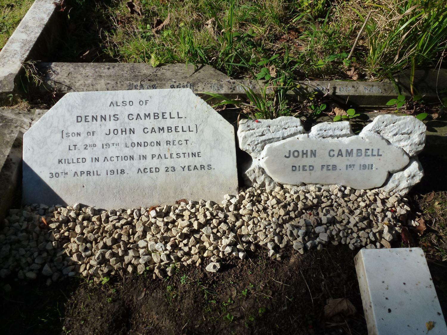 Dennis Clayton Gambell was born to John and Julia Gambell, at Aston Rowant, South Oxfordshire and baptised on 5th April 1895. 1901 census shows Dennis living at Woodway Farm with his parents, a governess and two servants. In 1914 the war medal records show Lieutenant Dennis Clayton Gambell is with the 19th London Regiment when he died on 30th April 1918. His mother Julia is now married to Walter Burrows Rowe and living at Fairfield, 5 Broadwater Road, Worthing. Dennis was killed in action in Palestine leaving effects of £1078.19s.10d. to Walter Burrows Rowe, gentleman. His mother is now living at "Lynwood" Shelley Road, Worthing.