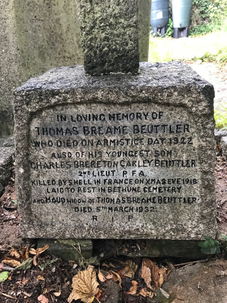 1889 Charles Brereton Oakley Beuttler was born in Bedford to Thomas Breame 35yrs and Maud 38yrs. Baptised at St Mary’s Bedford on 30 Jun. 1891 Census Living at Loudwater, Sussex Gardens, Margate – Young Gentlemans School: Thomas Breame 37yrs, Maud 40yrs, Gerald Oakley 11yrs, Sybil Brereton 8yrs Charles 1yr plus tutors and boarders 1901 Census Charles Beuttler 11yrs boarding pupil at 29 & 31 Eaton Place Brighton - a boarding school run by William Aldon and his wife Elizabeth. 1914 Serving with 94th Brigade, Royal Field Artillery. 1915 Promoted to 2nd Lieutenant on 1 Dec. 1916 Sent to France on 16 Mar. 1916 Stationed in Bethune. The town was heavily bombed by the Germans on 23 Dec causing many casualties. Charles died of his wounds on 24 Dec (see French Death Certificate). 24/12/1916 Killed in Action France aged 27yrs a 2nd Lieutenant Royal Horse Artillery and Royal Field Artillery 21st Division of 94th Brigade "A" Battery Buried in Bethune Town Cemetery. Commemorated on West Tarring Parish Church War memorial Charles left effects of £74.0s.7d to his mother Maud Beuttler widow, living at Roydene, St Michaels Road, Worthing