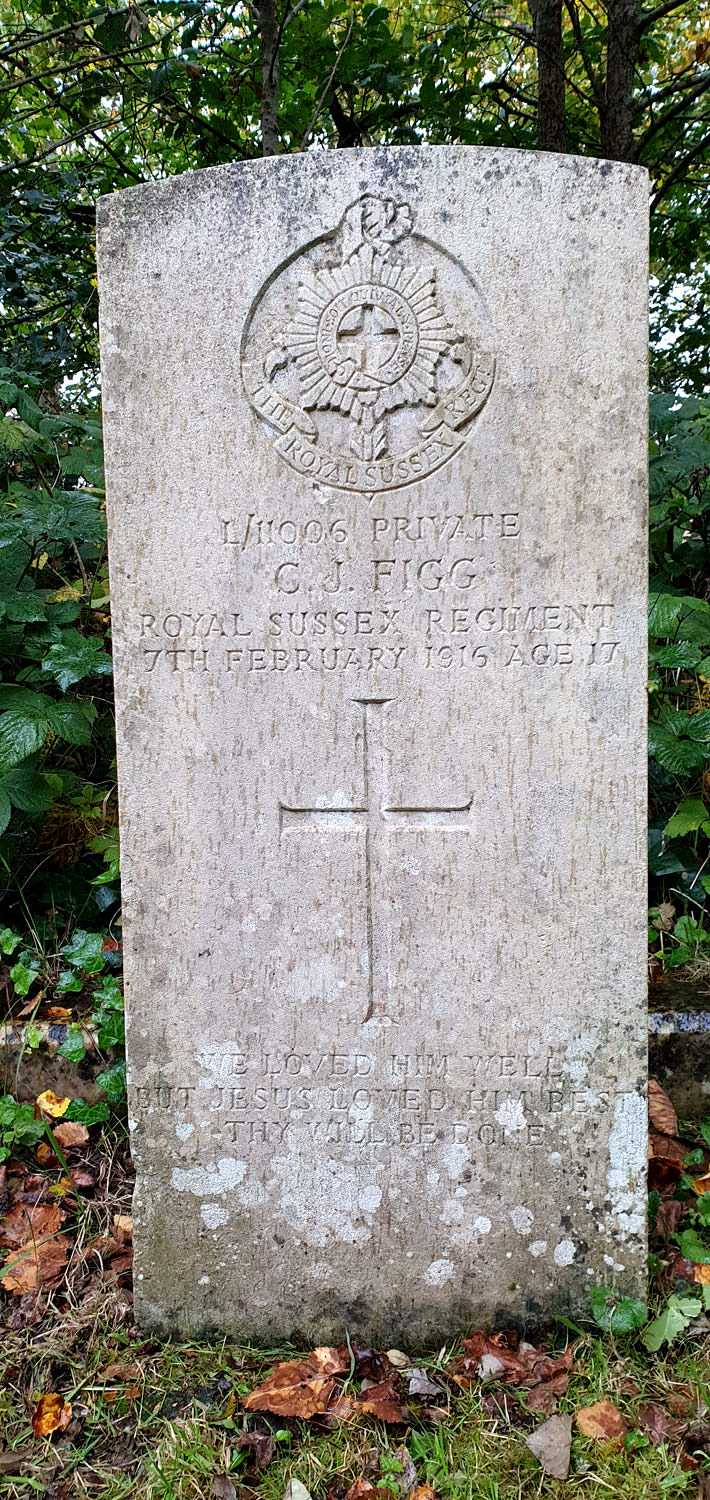 World War 1 - Roll of Honour with detailed information - Private L 11006, 3rd Reserve Battalion, The Royal Sussex Regiment. Died of meningitis at home 3 February 1916. Aged 17. Son of Arthur (ASC serving in Egypt) and Mary Figg of 5, Heene Place, Worthing. Born in Worthing and enlisted in Hove Heene Parish Church War Memorial. Buried in St Botolph's Churchyard, Heene, Worthing: